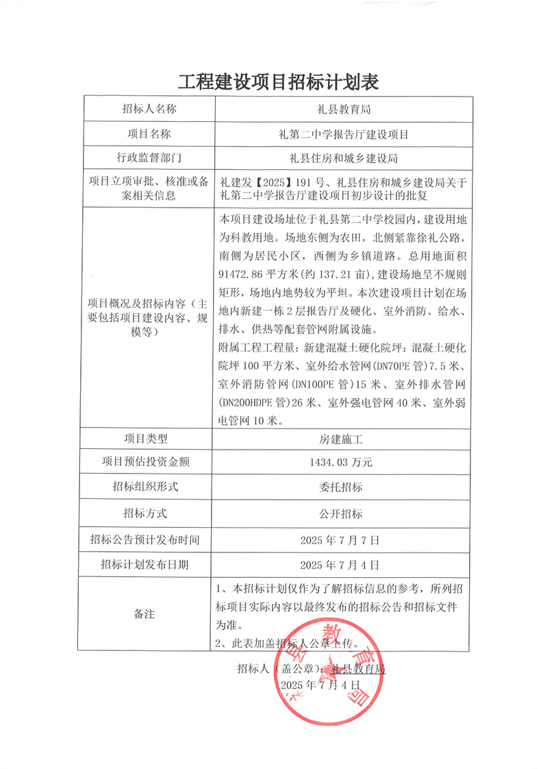 禮縣第二中學(xué)報(bào)告廳建設(shè)項(xiàng)目