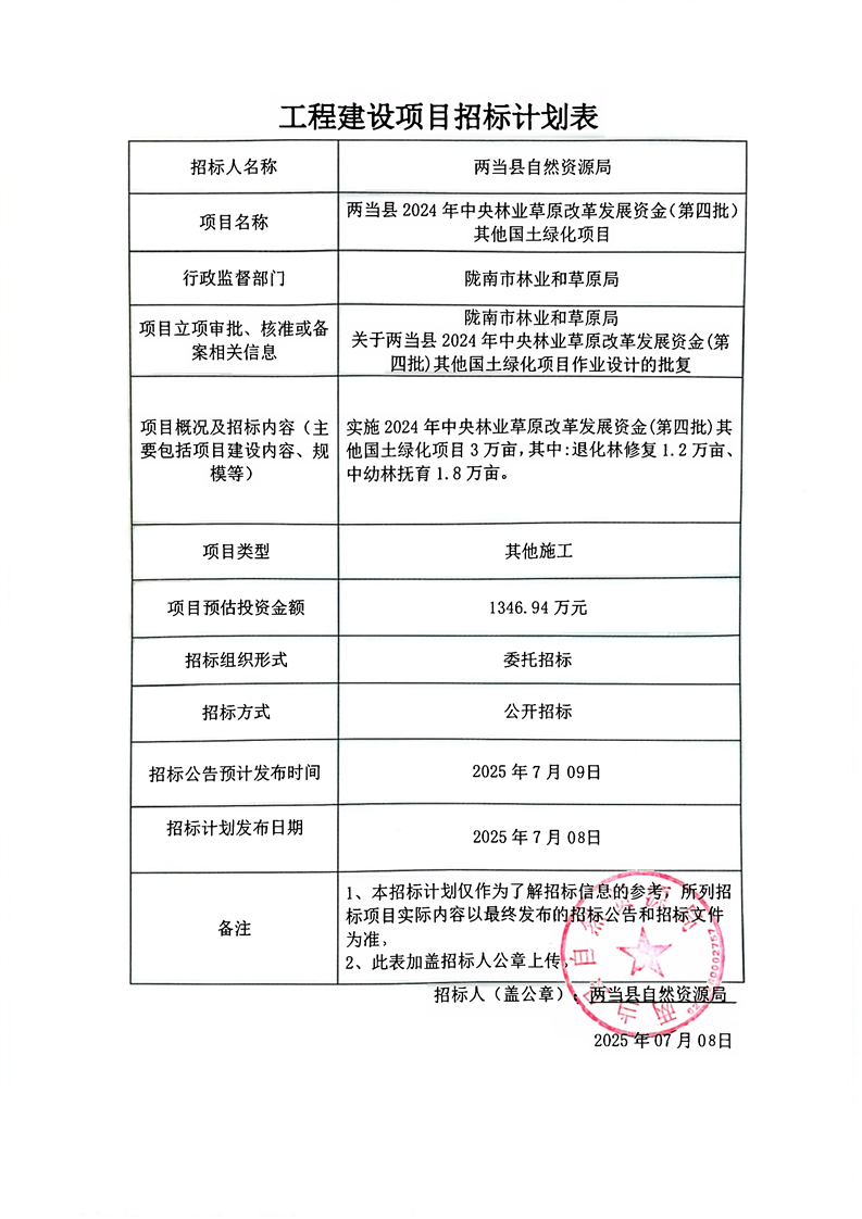 兩當縣2024年中央林業(yè)草原改革發(fā)展資金(第四批)其他國土綠化項目