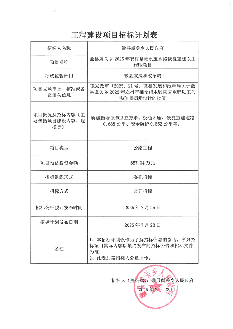 徽縣虞關鄉(xiāng)2025年農村基礎設施水毀恢復重建以工代賑項目