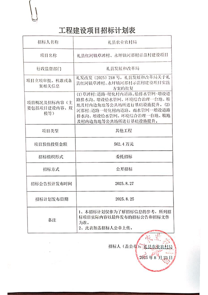 招標計劃-禮縣紅河鎮(zhèn)草灘村、永坪鎮(zhèn)河那村示范村建設(shè)項目.pdf