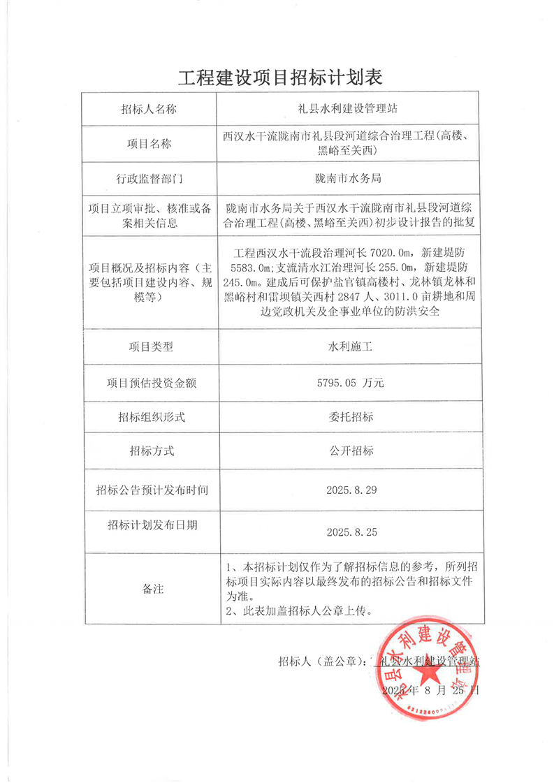 西漢水干流隴南市禮縣段河道綜合治理工程(高樓、黑峪至關(guān)西)
