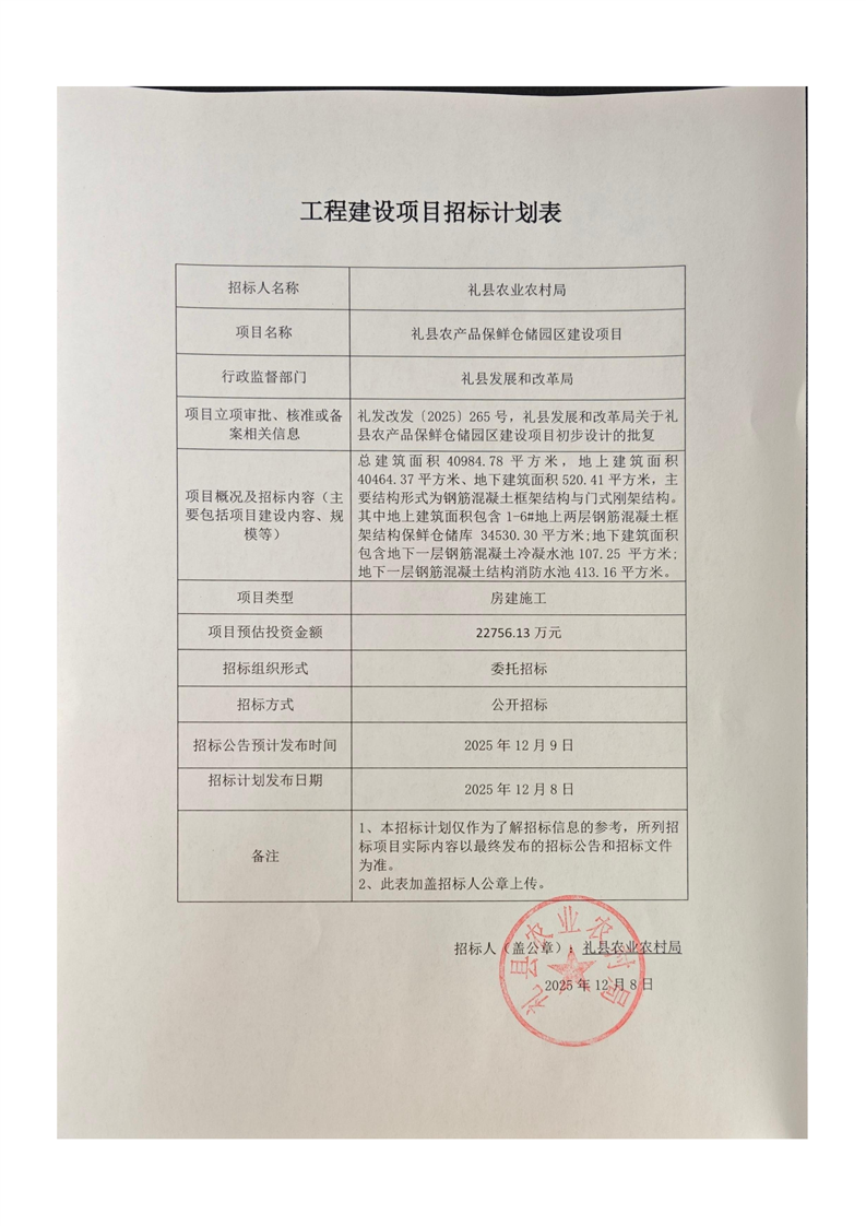 禮縣農(nóng)產(chǎn)品保鮮倉儲(chǔ)園區(qū)建設(shè)項(xiàng)目