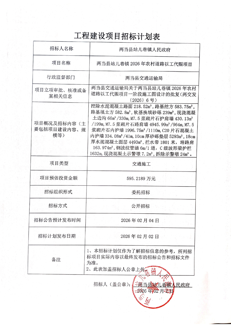 兩當(dāng)縣站兒巷鎮(zhèn)2026年農(nóng)村道路以工代賑項(xiàng)目